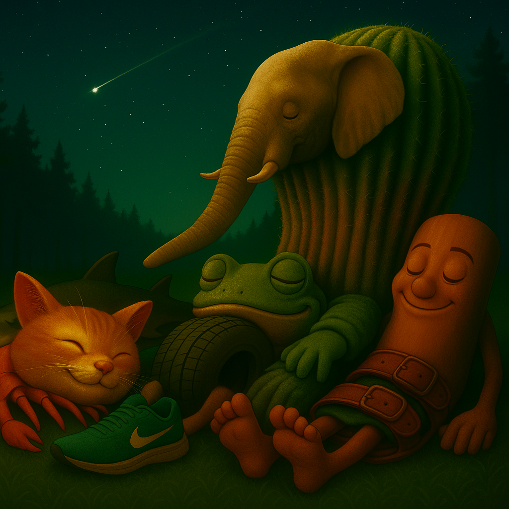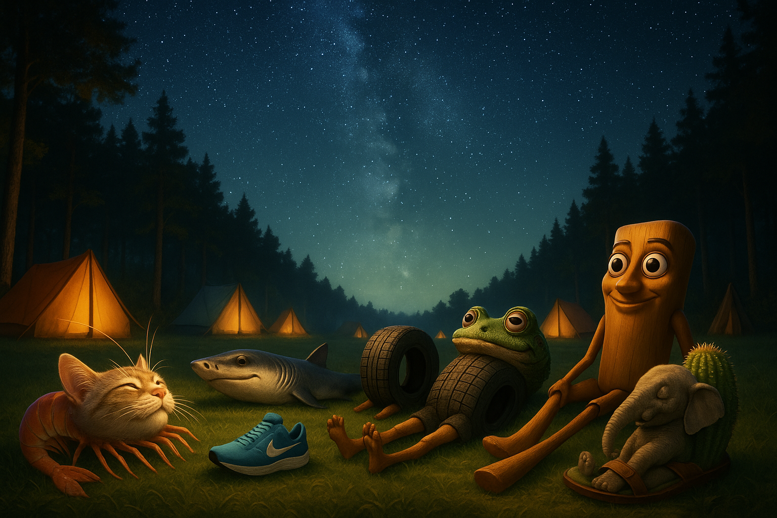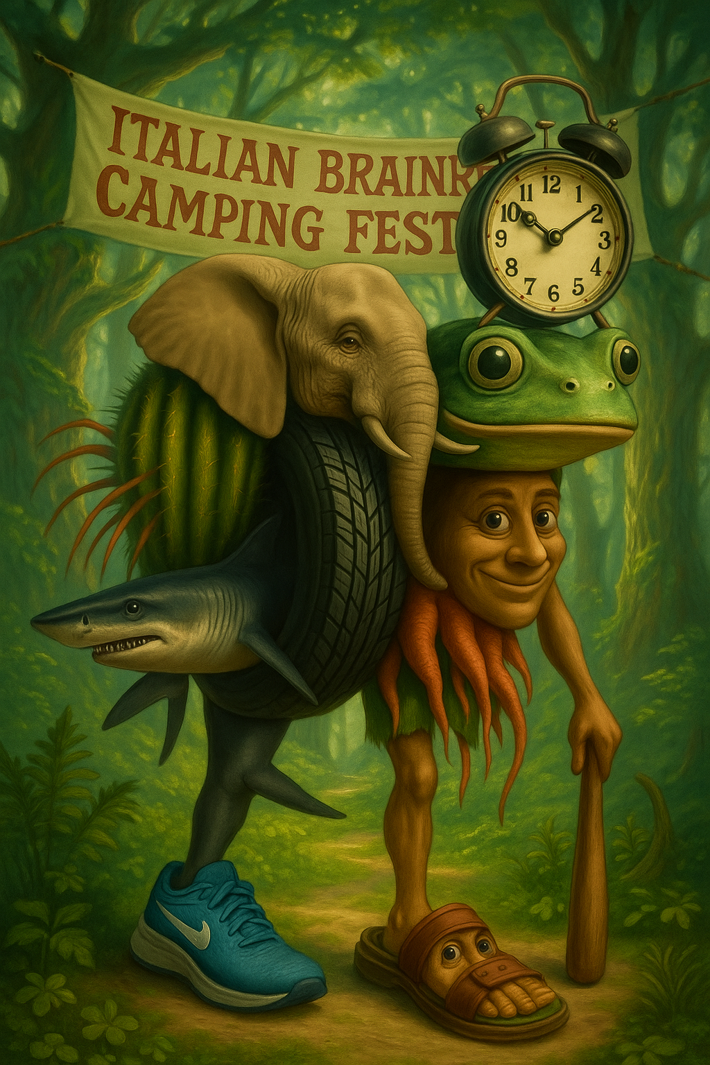 전 세계(?)에서 모인 브레인롯 캐릭터들이 텐트도 치고, 꼬치구이 굽고, 노래 부르고 춤추면서 제대로 즐기고 있었어.